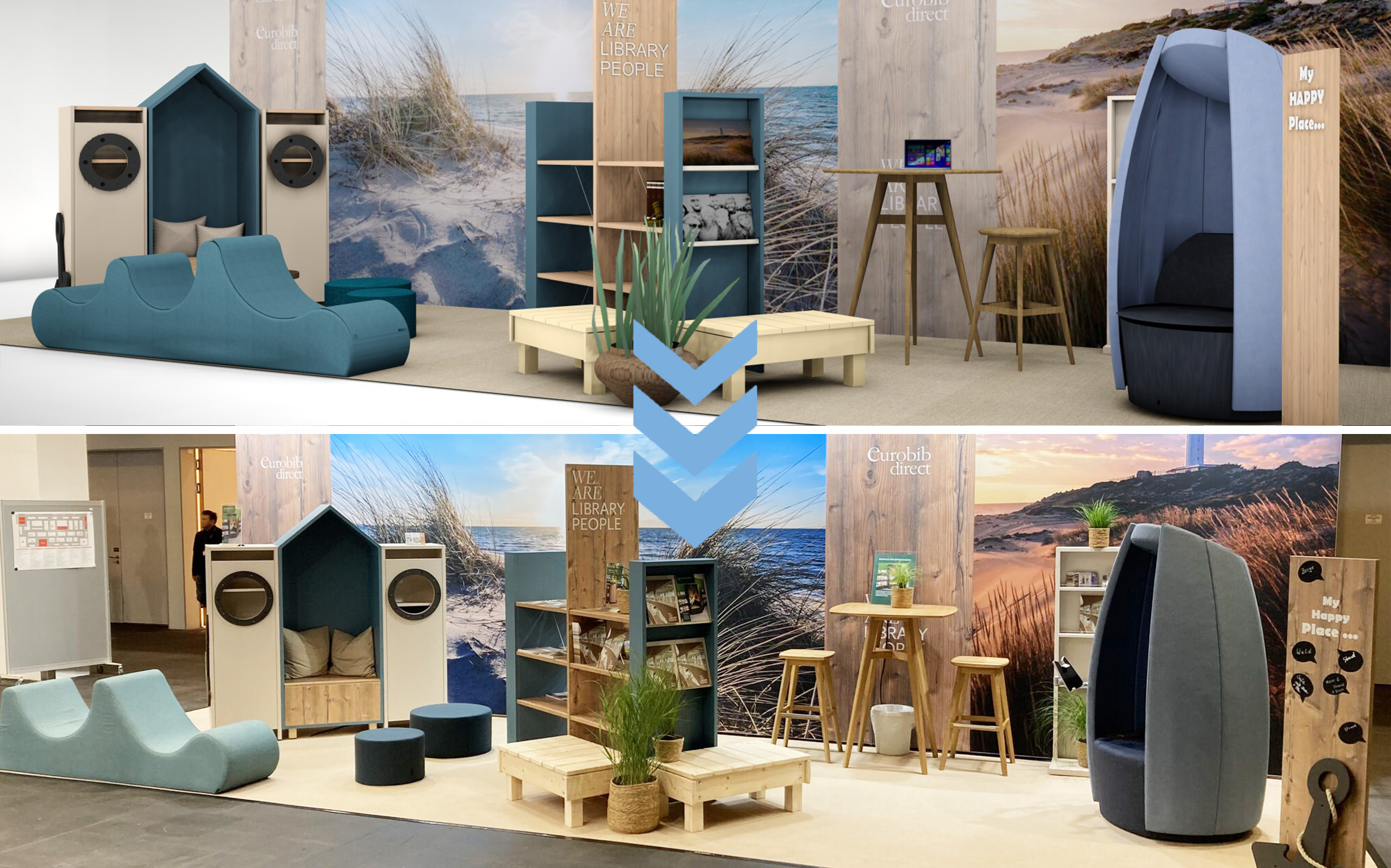 As we delved into the intricacies of designing our stand for BiblioCon, our focus shifted towards translating our thematic vision into tangible elements that captivate the senses and ignite the imagination. We also had to adhere to the economic framework for the exhibition, just as our design projects are based on a specific budget. With biophilic library design as our guiding principle and the serene beauty of the beach and Nordic shores as our inspiration, we carved out distinct zones that catered to the diverse needs and interests of our visitors.