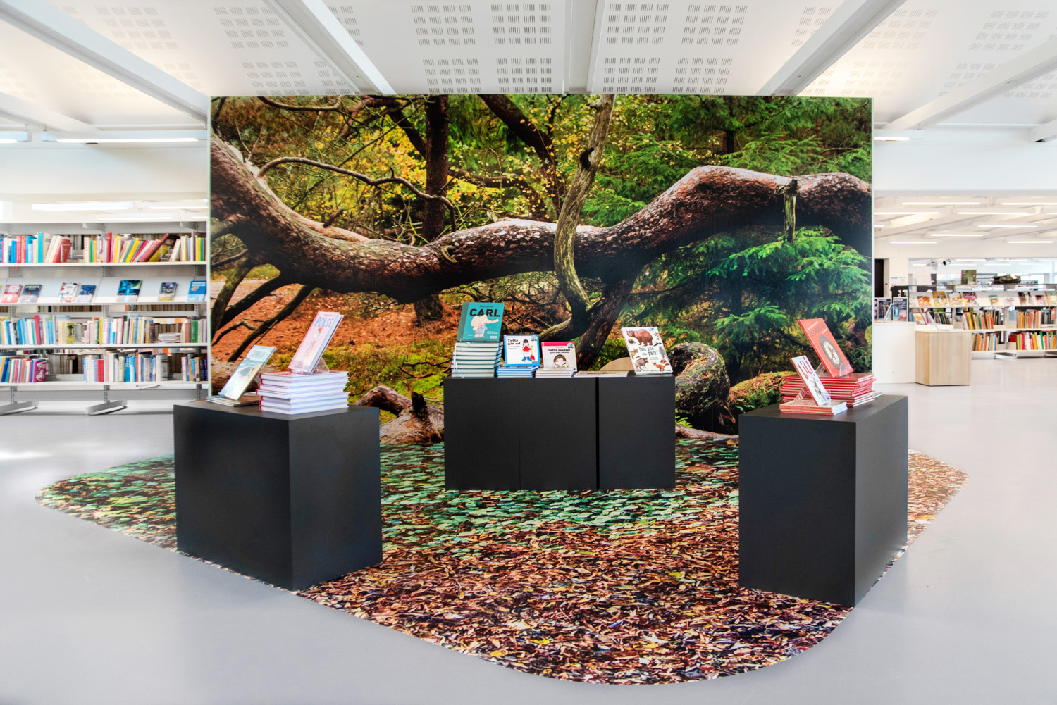 By bringing the forest and the beach into the library, the visitors can undisturbedly enjoy a walk between the trees or take a sailing trip on the ocean. We introduced specially designed trees as end panels to the shelving systems with books on hanging displays, matching surrounding browsers as well as graphics on the floor with images of the forest underfoot, natural rocks, the ocean and sand.