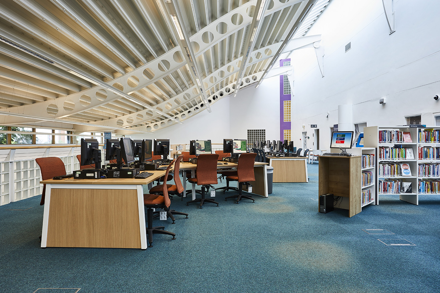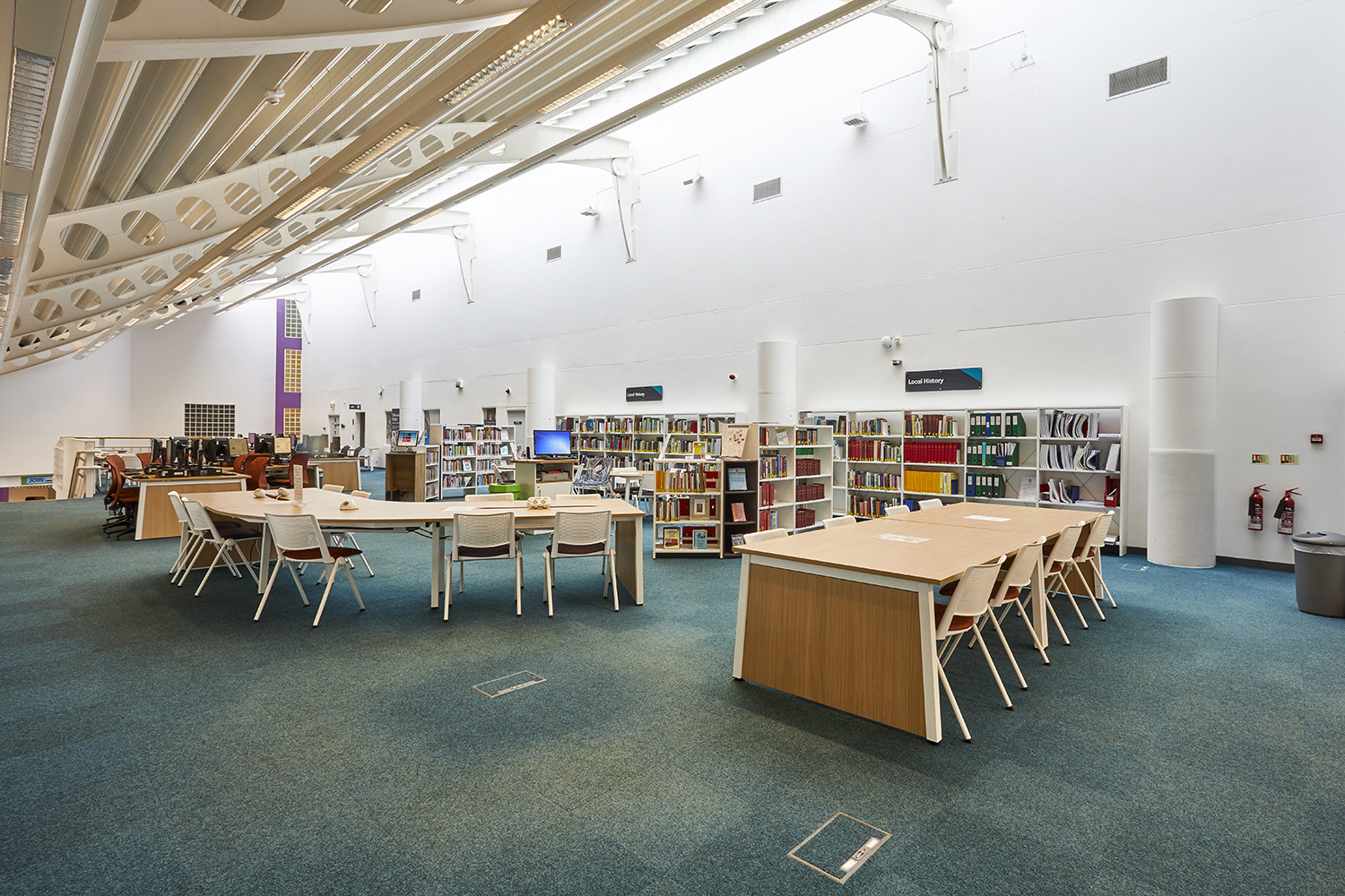 Works carried out included new shelving & furniture throughout. Our approach to the re-design was to create a space that is functional for all users. Introducing various seating and study positions invites users to enjoy their time in the library with a ’home from home’ feel.