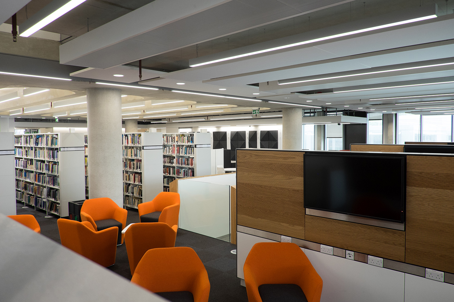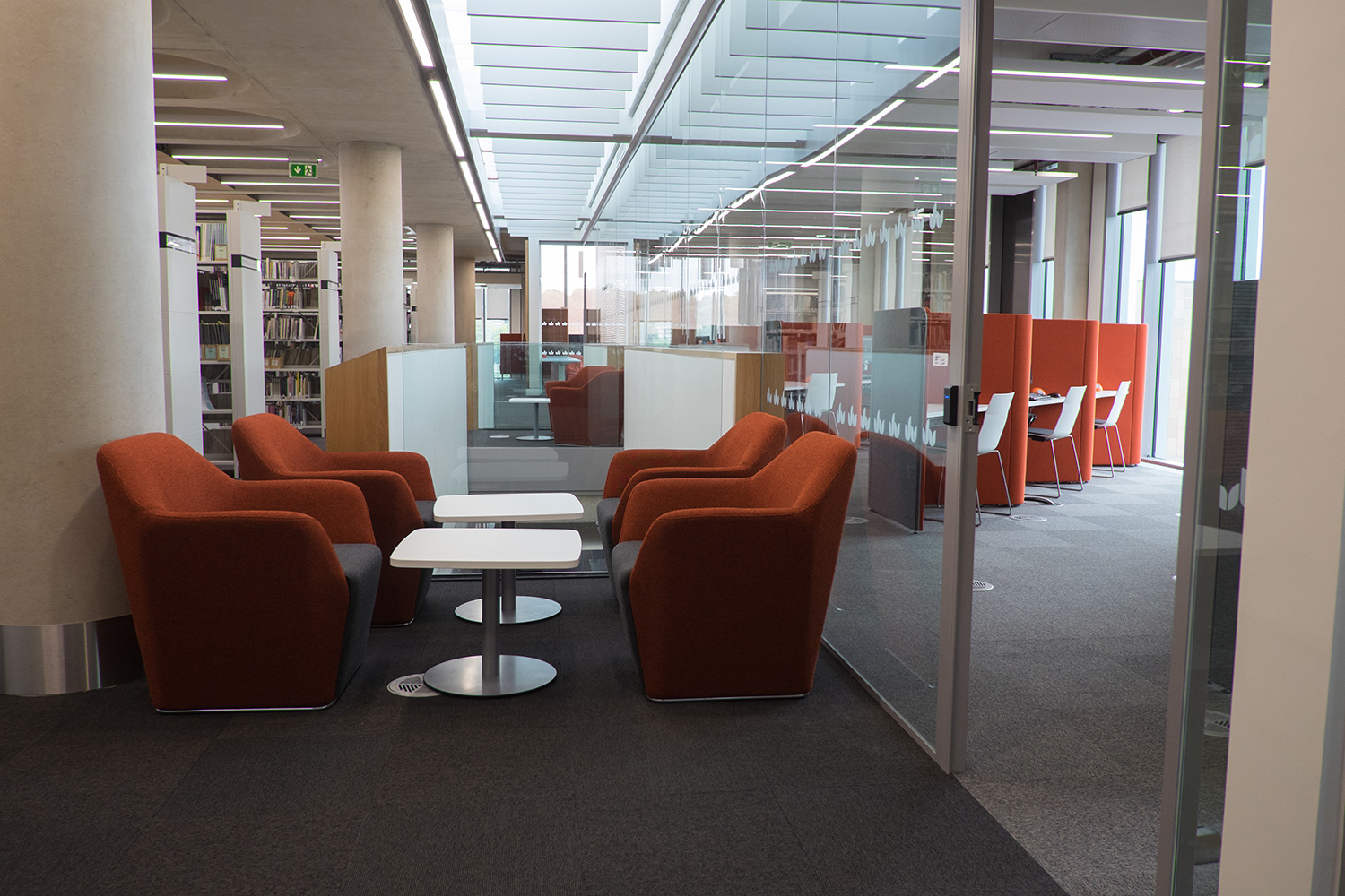 Booths can be seen in various colour ranges through the library. Arm chairs with high backs, reduces sound from surrounding areas and are integrated with work surfaces and pluto power stations have been added that allow students to plug-in laptops and also have twin USB ports. Five person circular table/desk capable of accommodating computer screens with power-up and down option to provide screen-less, flat table surface when required, keyboard and mouse housing and integral cable tray is also included. Working with the University’s existing shelving system, the study booths give the space a modern feel and injects an array of colours to the entire space.