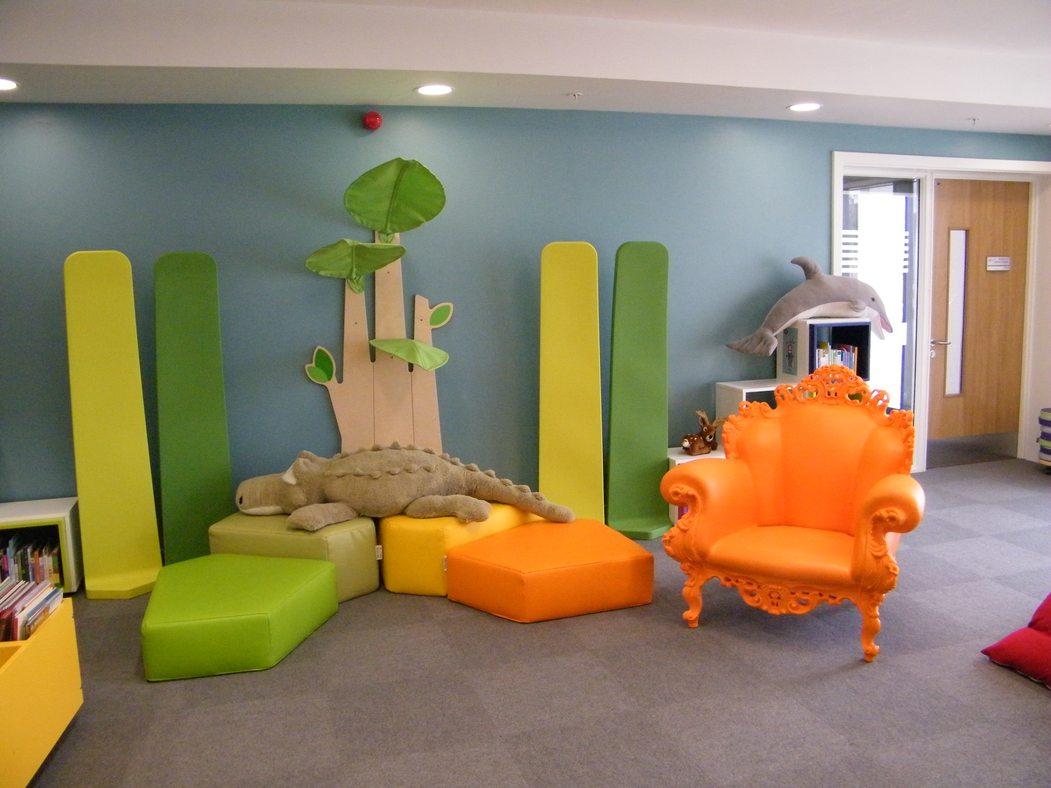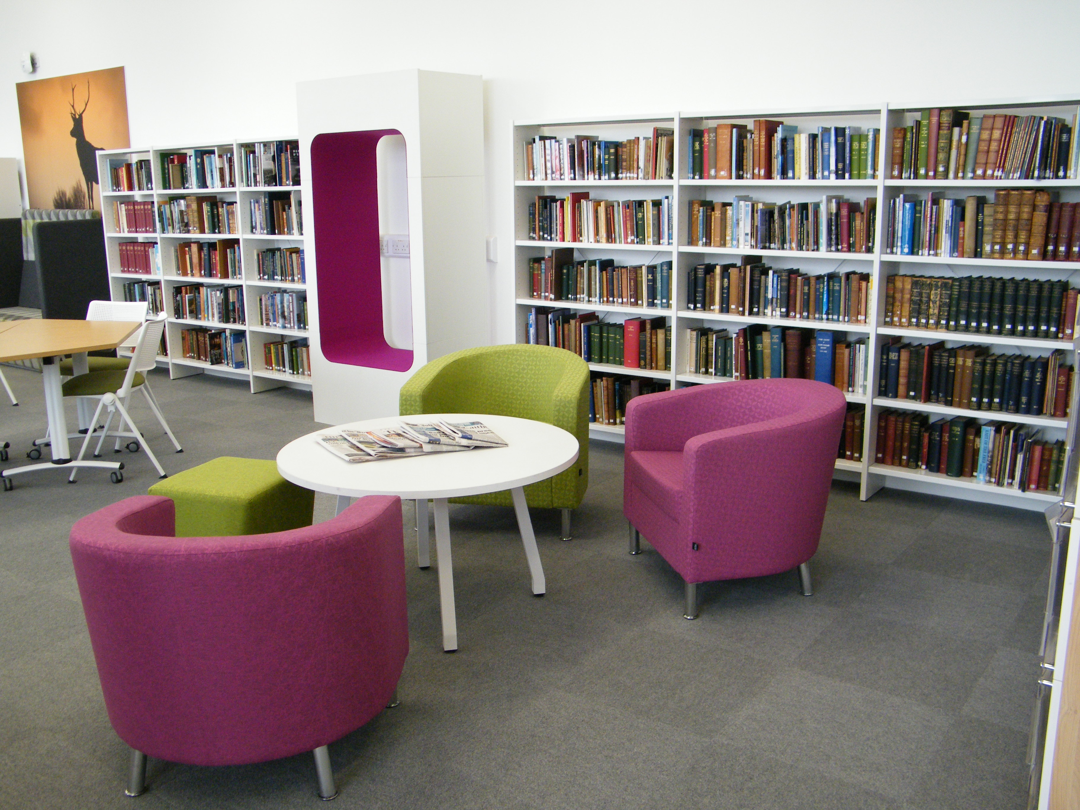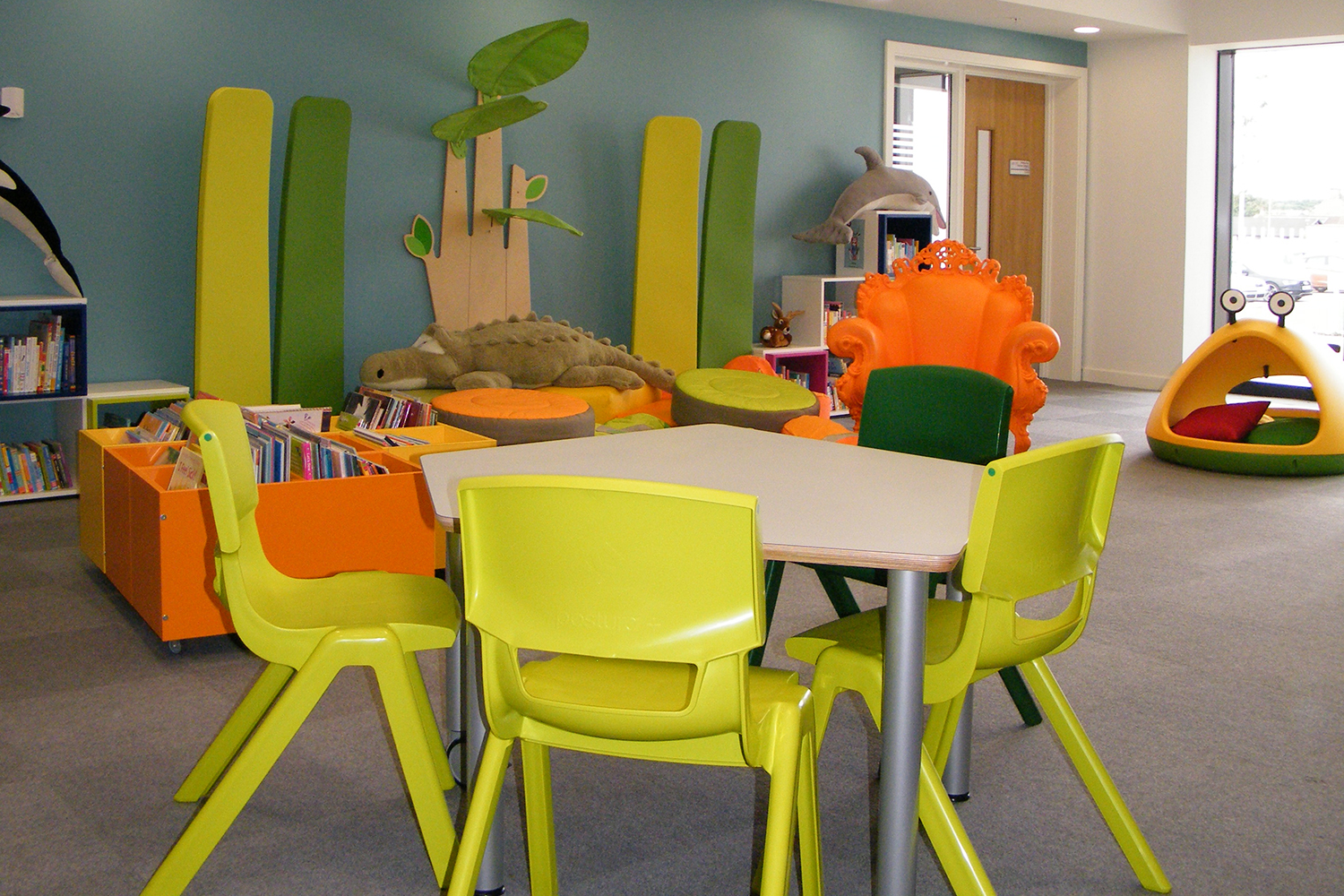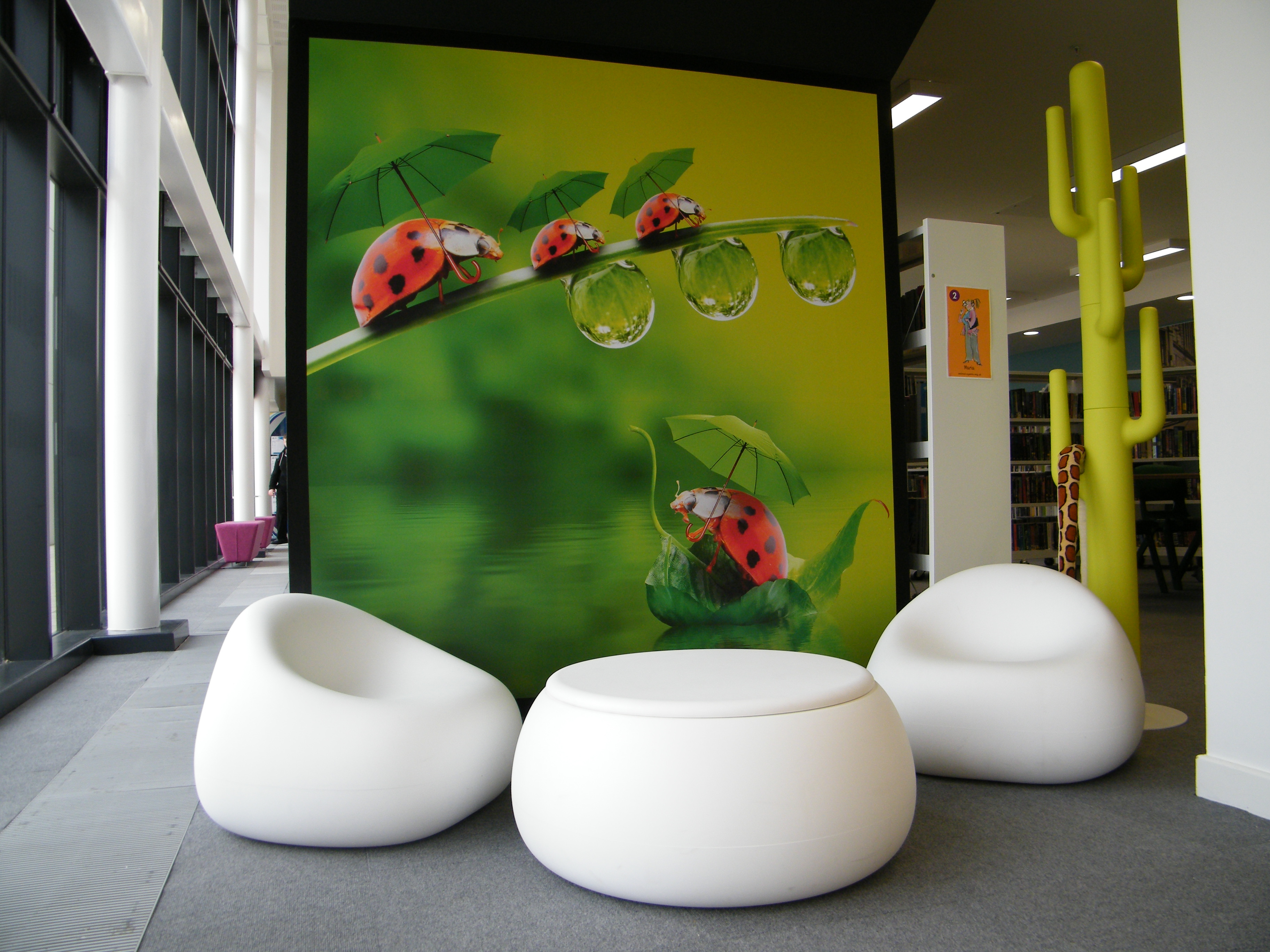 The Children’s area can be seen by passers-by and the use of brightly coloured graphics, soft furnishings and fun furniture encourage children to come in, stay and enjoy their time in the library.