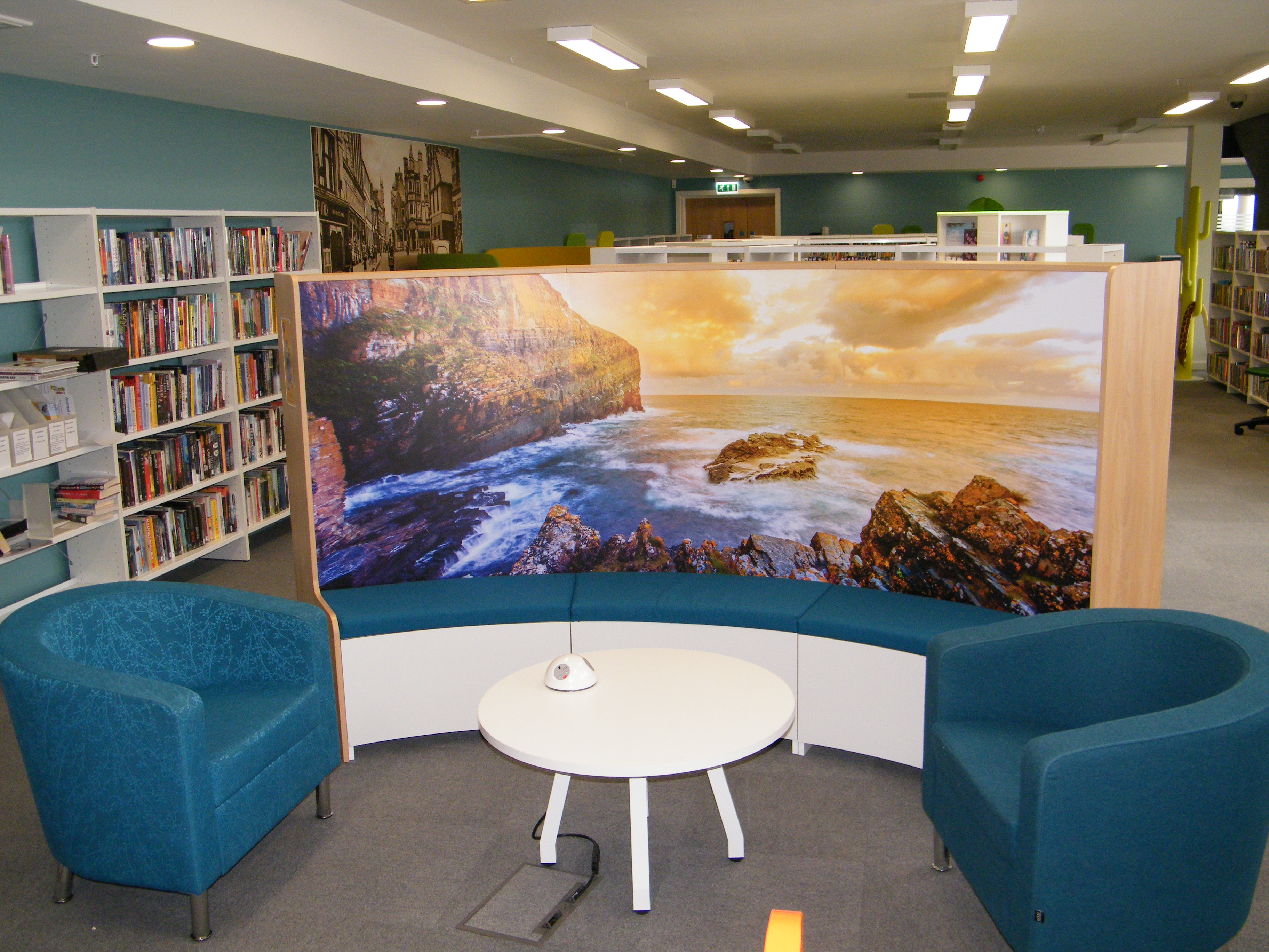 Throughout the library, Cocoon furniture creates a break in shelving and offers visitors alternative seating options. Exciting graphics, that capture the heritage of Wick, can be seen on the walls and as backing for curved soft seating and encourage visitors from all over the world to come in, get comfortable and enjoy their surroundings.