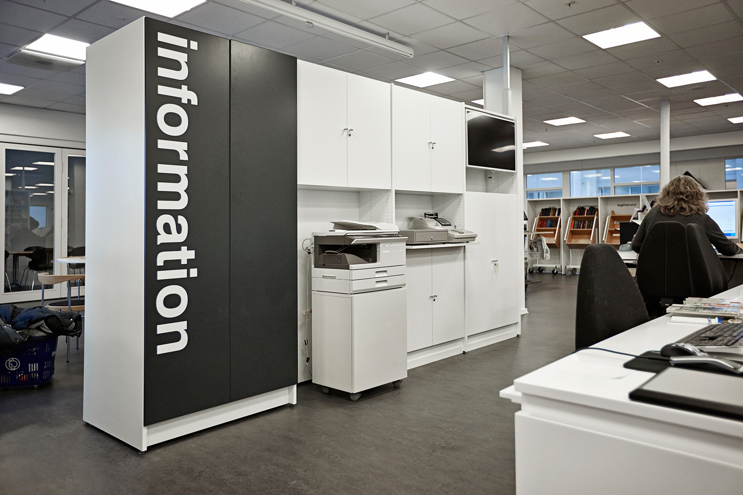 Through creative and clever space planning, the result is a spacious and welcoming library with assigned areas for silence and reading, as well as areas for talking and discussions. Don’t miss the children’s corner with its round shelving and illustrations by local artist.