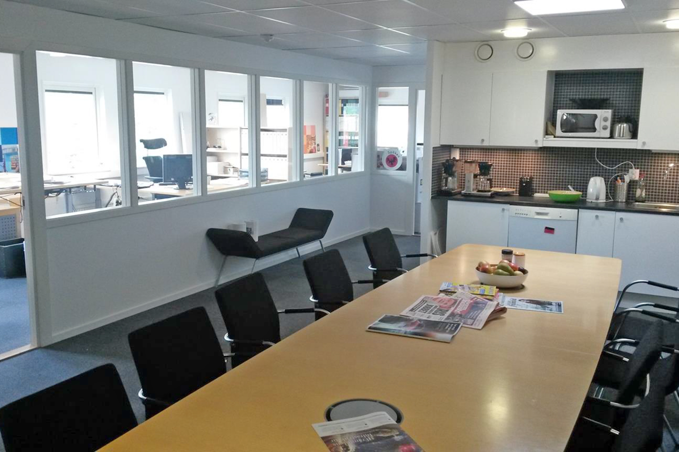There is about 250 m2 housing a large canteen, three rooms for 10 staff members and a small meeting room. The Swedish staff is very happy about the excellent acoustic qualities created by the ceiling material and carpets.